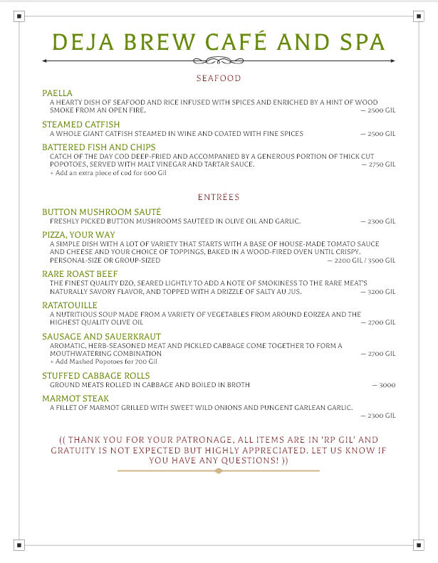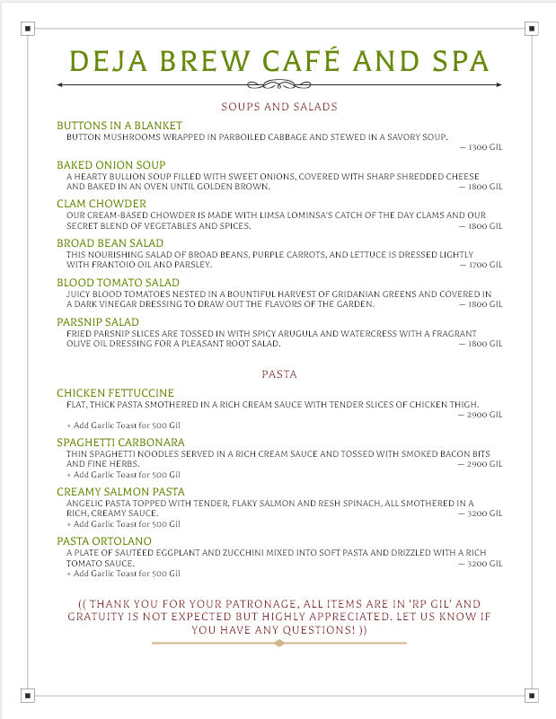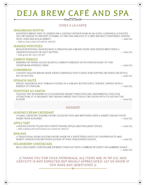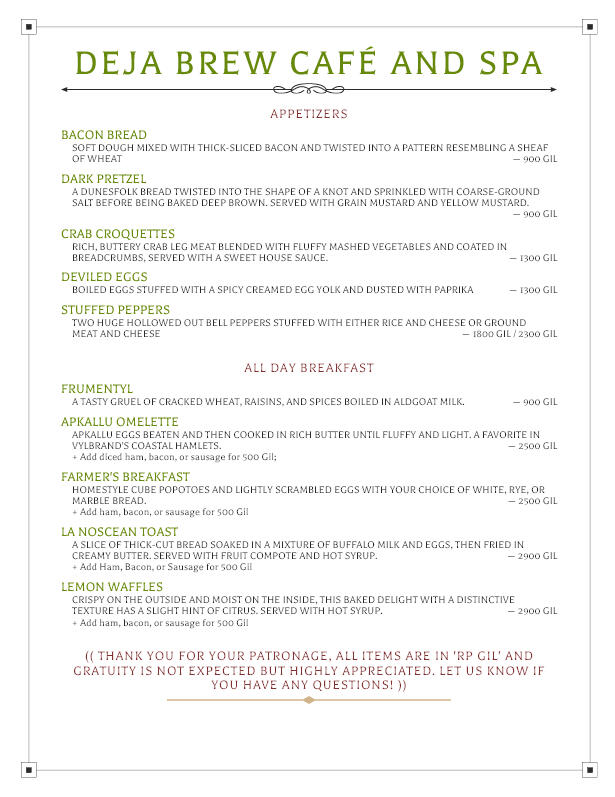 The Deja Brew Cafe and Spa is a cafe and spa located in Shirogane. We offer a number of services but primarily we are here to provide companionship, good food, and good drinks. If you're lonely and need someone to talk to or just have a want for all day breakfast, stop in and we can fufil your needs!More to come in the future, keep an eye out for Employee profiles!